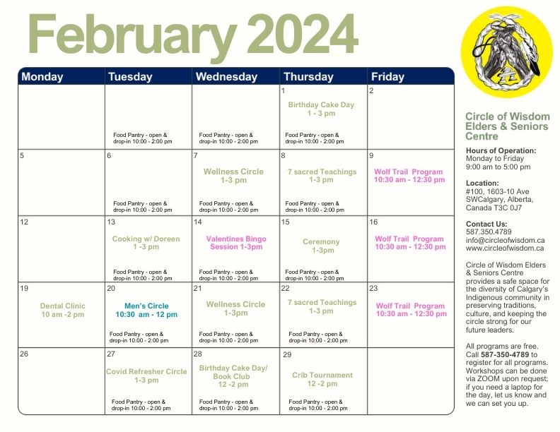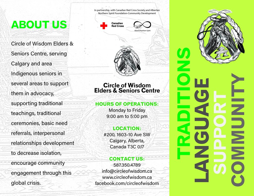 Circle of Wisdom Elders & Seniors Centre, serving Calgary and area Indigenous seniors in several areas to support them in advocacy, supporting traditional teachings, traditional ceremonies, basic need referrals, interpersonal relationships development to decrease isolation, encourage community engagement through this global crisis.