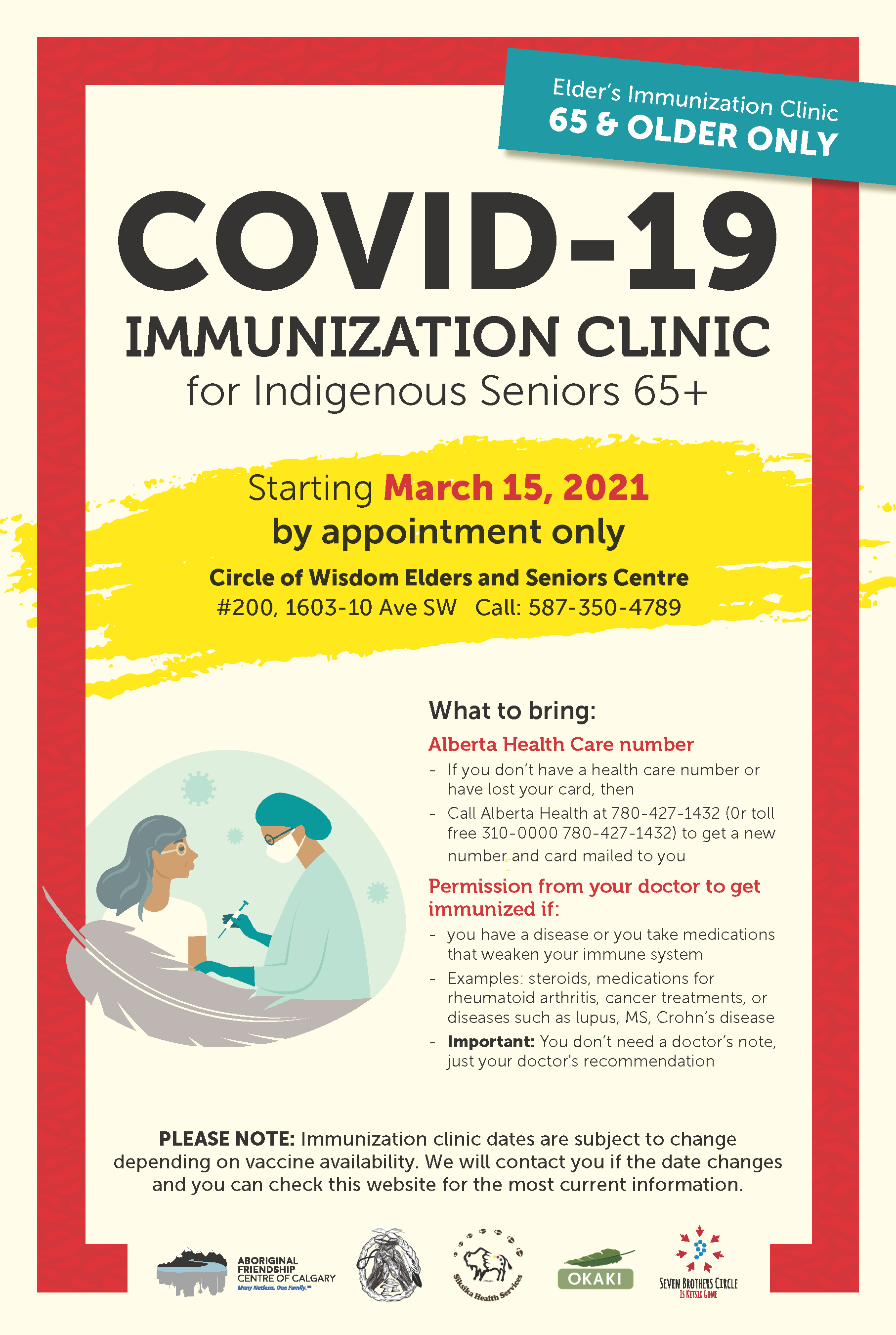 Circle of Wisdom Elder & Centre (Lodge) Centre in partnership with Aboriginal Friendship Centre of Calgary, Siksika Health Services, OKAKI, Seven Brothers Circle is currently taking vaccination appointments. Urban Indigenous Immunization Clinic opening on Monday Marc h 15, 2021 at the Circle of Wisdom Elder & Seniors Centre location, if you know Indigenous Elder/seniors that haven’t receive their Covid-19 vaccination, please call us. 587.350.4789 to book an appointment.