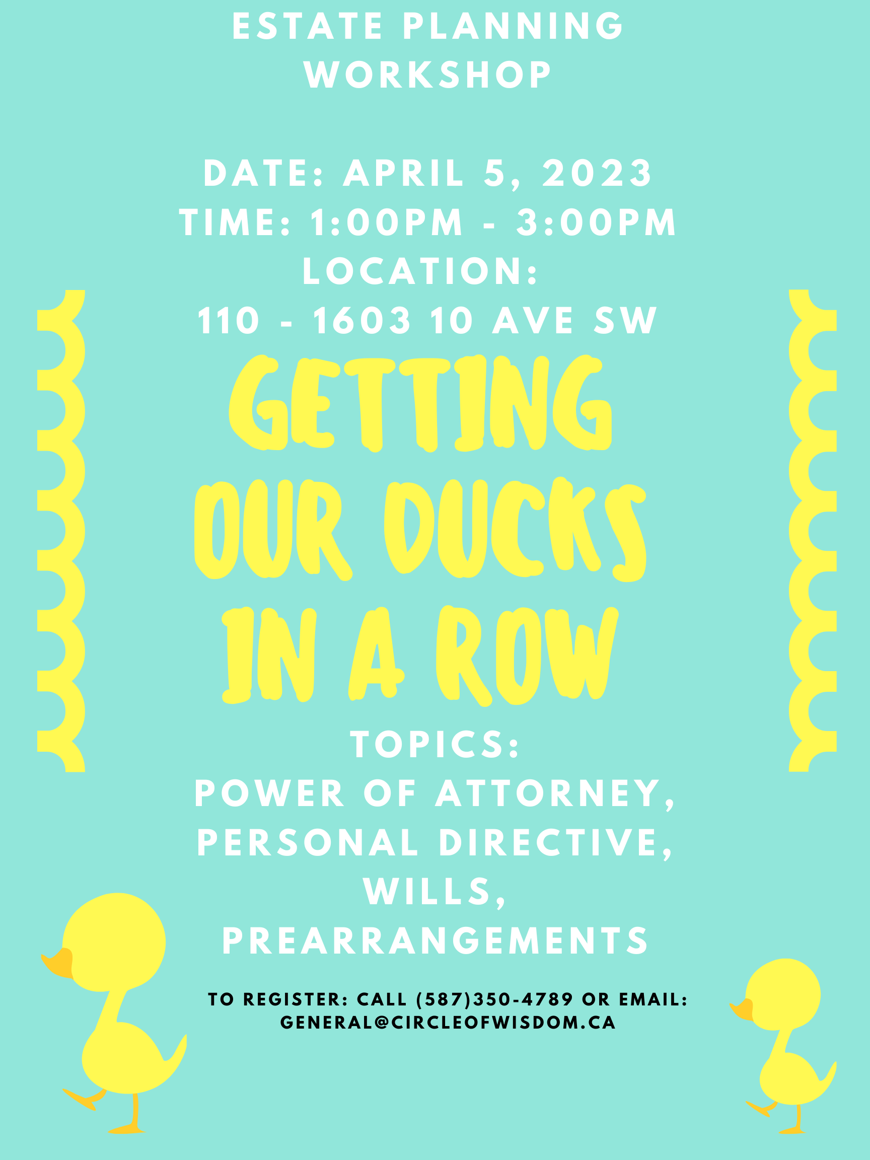 Getting our Ducks in a Row Topic: Power of Attorney, Personal Directive, Wills, Prearranagements April 5th, 2023 1:00pm to 3:00pm Call to register 587-350-4789 or email general@circleofwisdom.ca